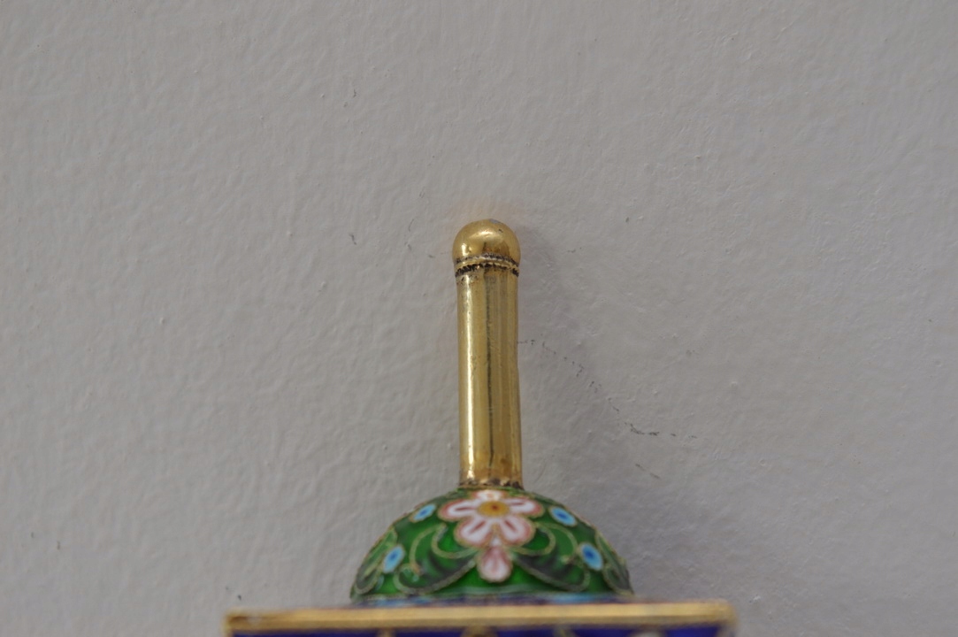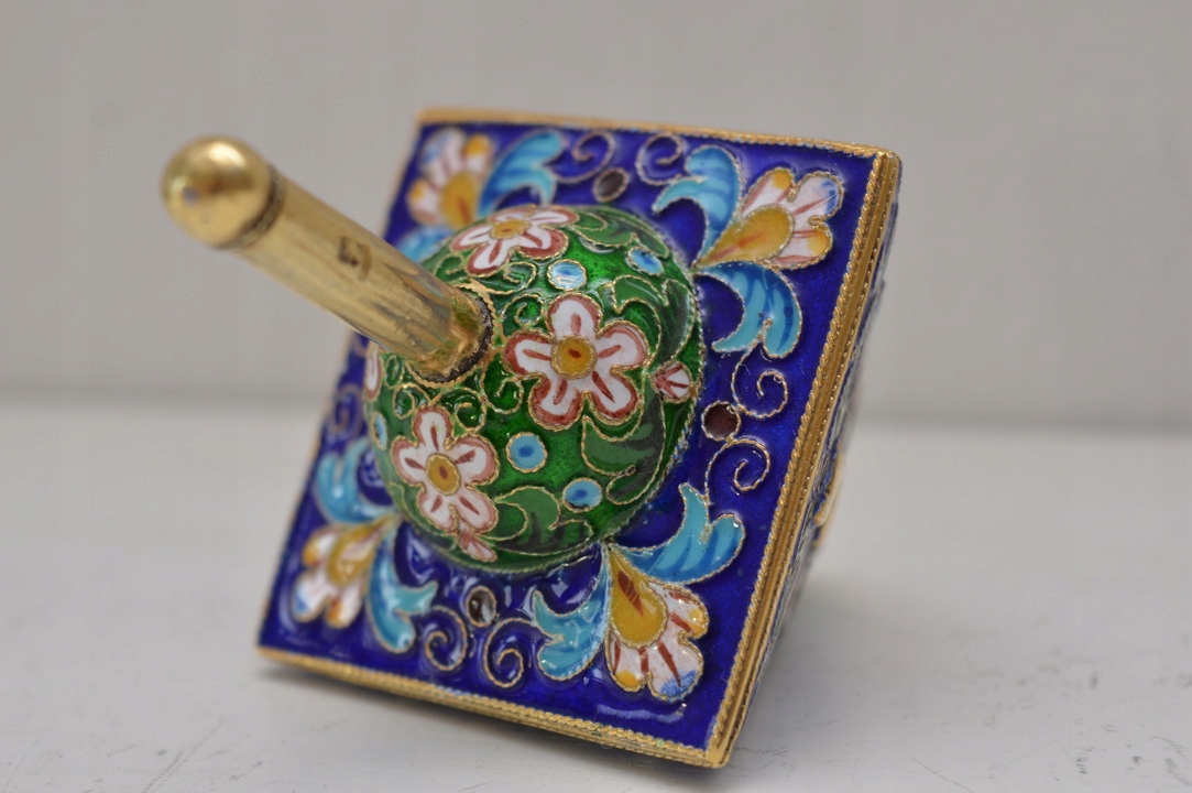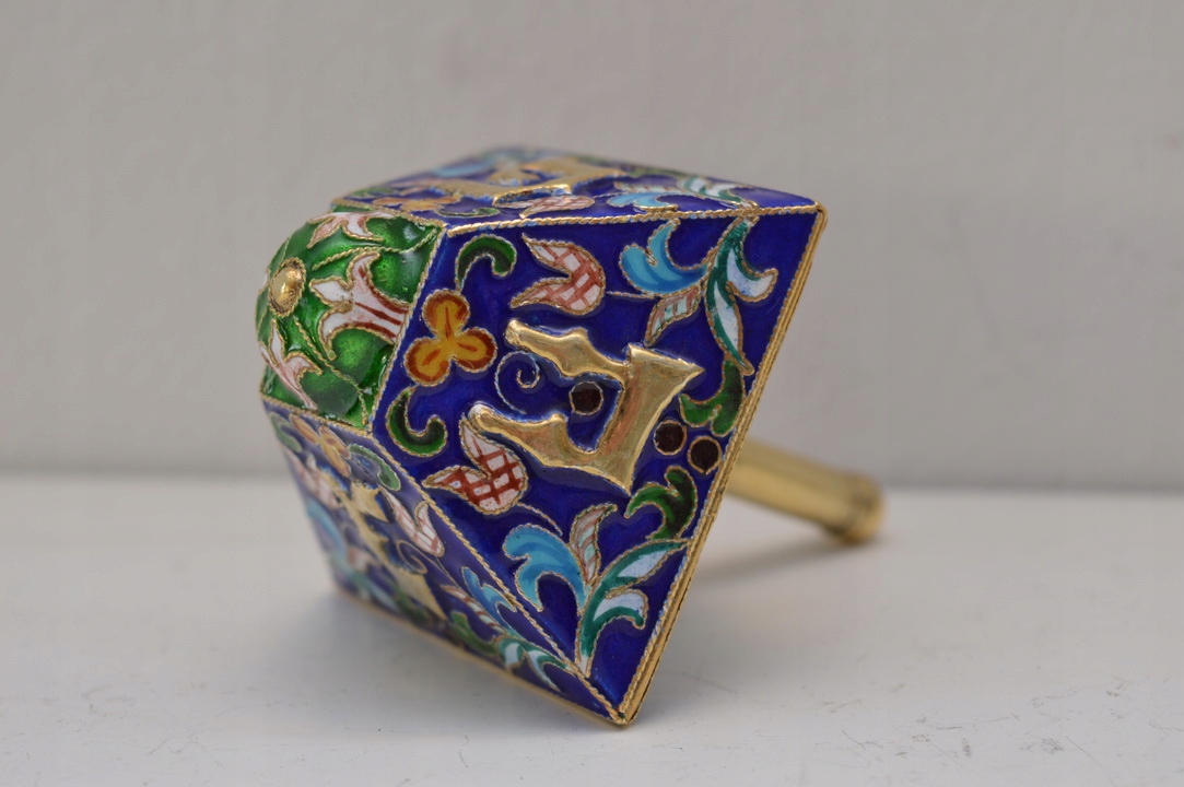 Серебро полностью позолочено, украшено разноцветной ячеистой эмалью.