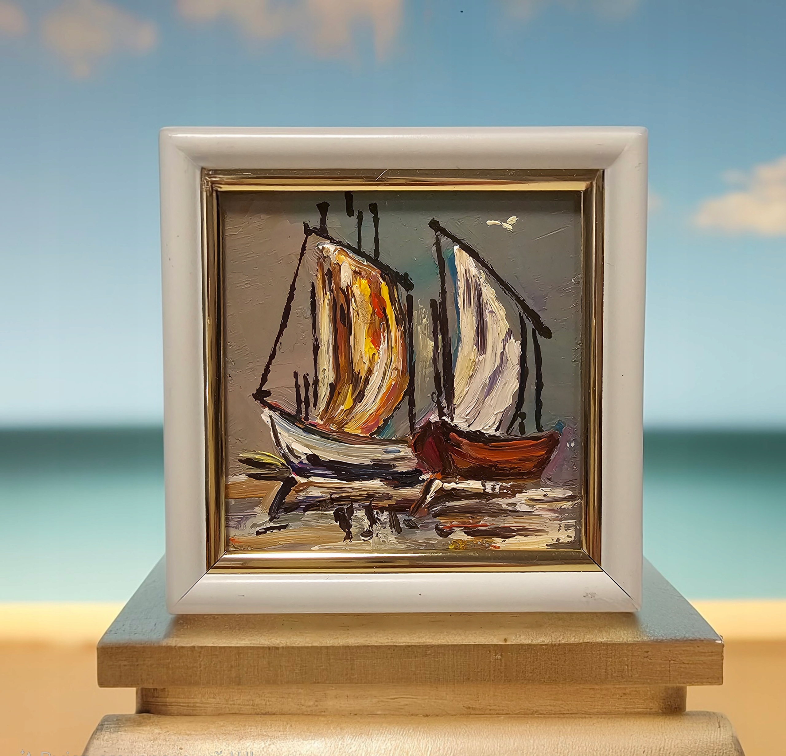 Картина «Дружба», написанная маслом на картоне, является настоящим произведением искусства. На ней изображен морской пейзаж с двумя парусниками, плывущими бок о бок по спокойному морю. Паруса, развевающиеся на ветру, символизируют крепкую дружбу и единство. Насыщенные оттенки разных цветов передают гармонию и отражают теплоту отношений. Этот морской пейзаж с парусными кораблями воплощает дух приключений и поддержки, делая картину источником вдохновения и радости.