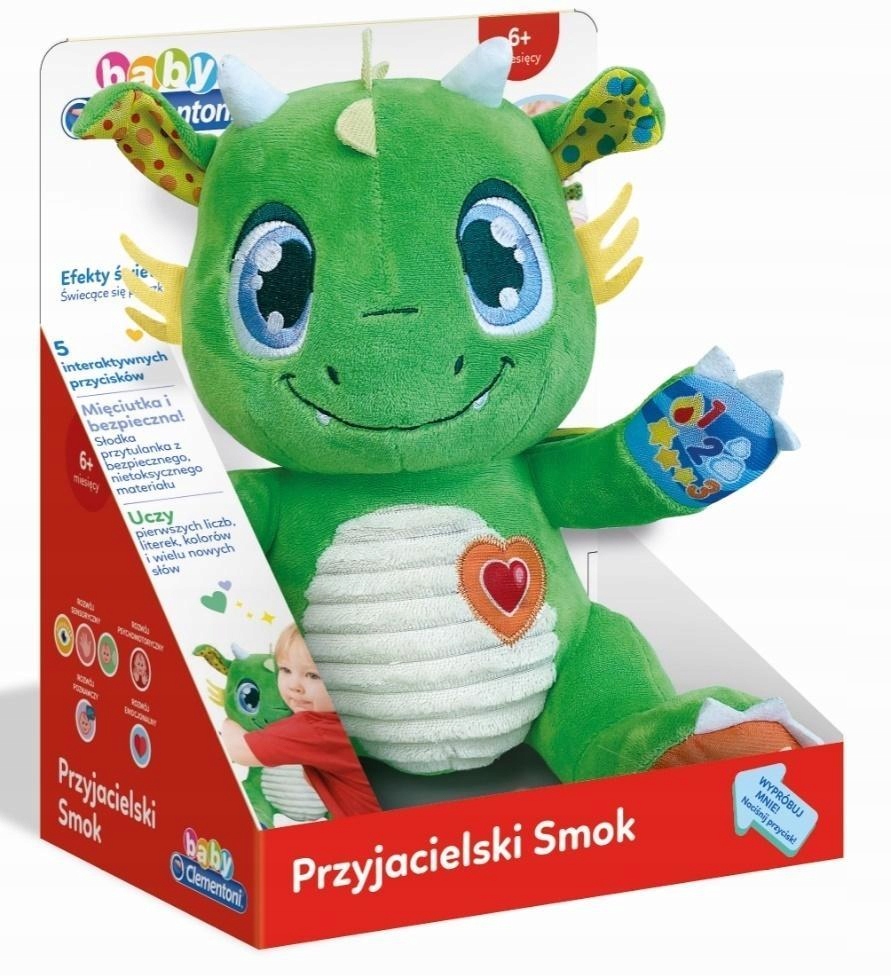 Очаровательный дракон из невероятно мягкого плюша — идеальный товарищ по играм в мире приключений и воображения! Благодаря бесчисленным звуковым и световым эффектам он знакомит детей с образовательным контентом с помощью песен, стишков и забавных поговорок. Он развивает мануальные навыки, умение слушать и эмоциональную зрелость, помогая ребенку изучить язык и выучить много новых слов.
