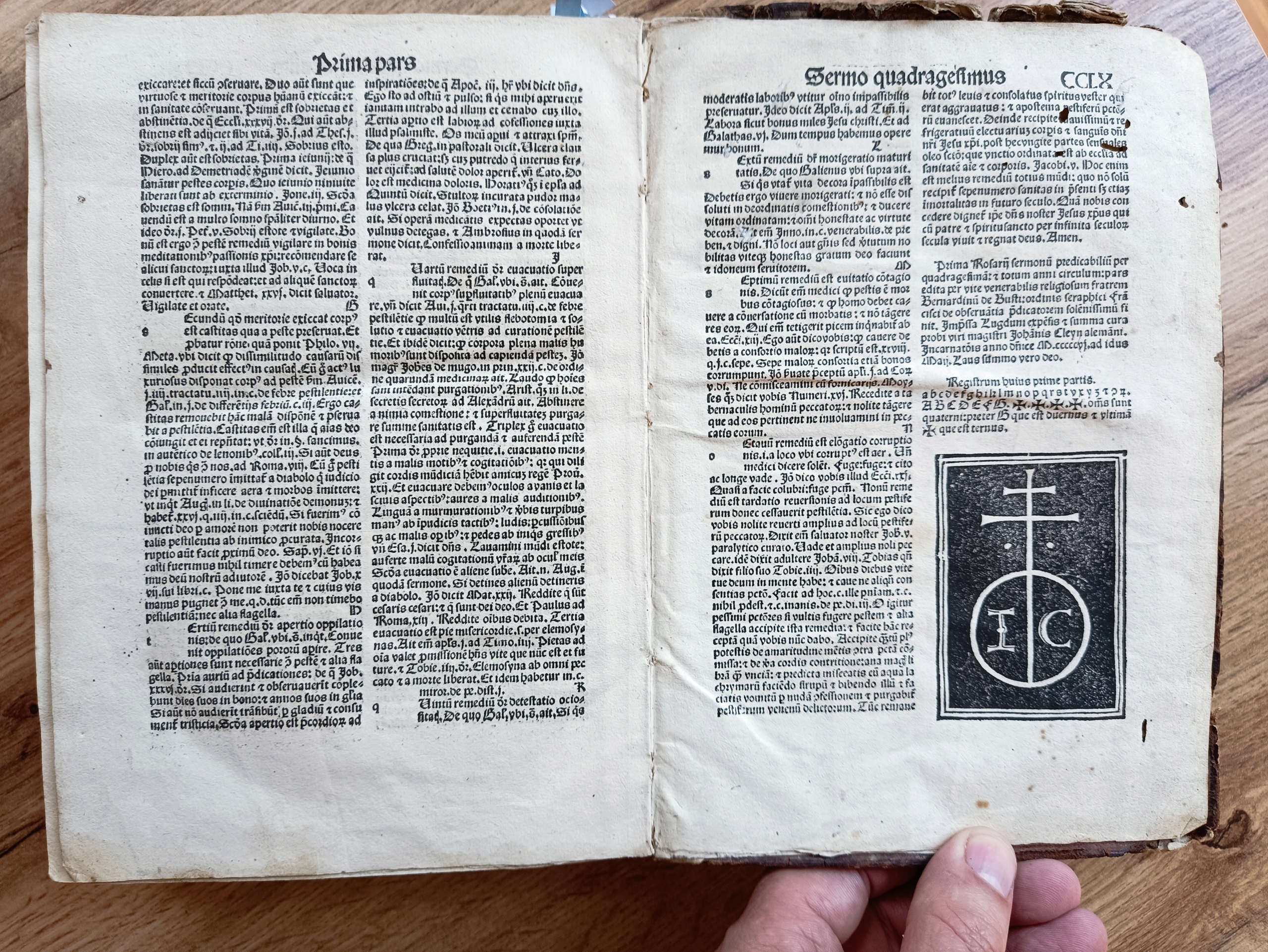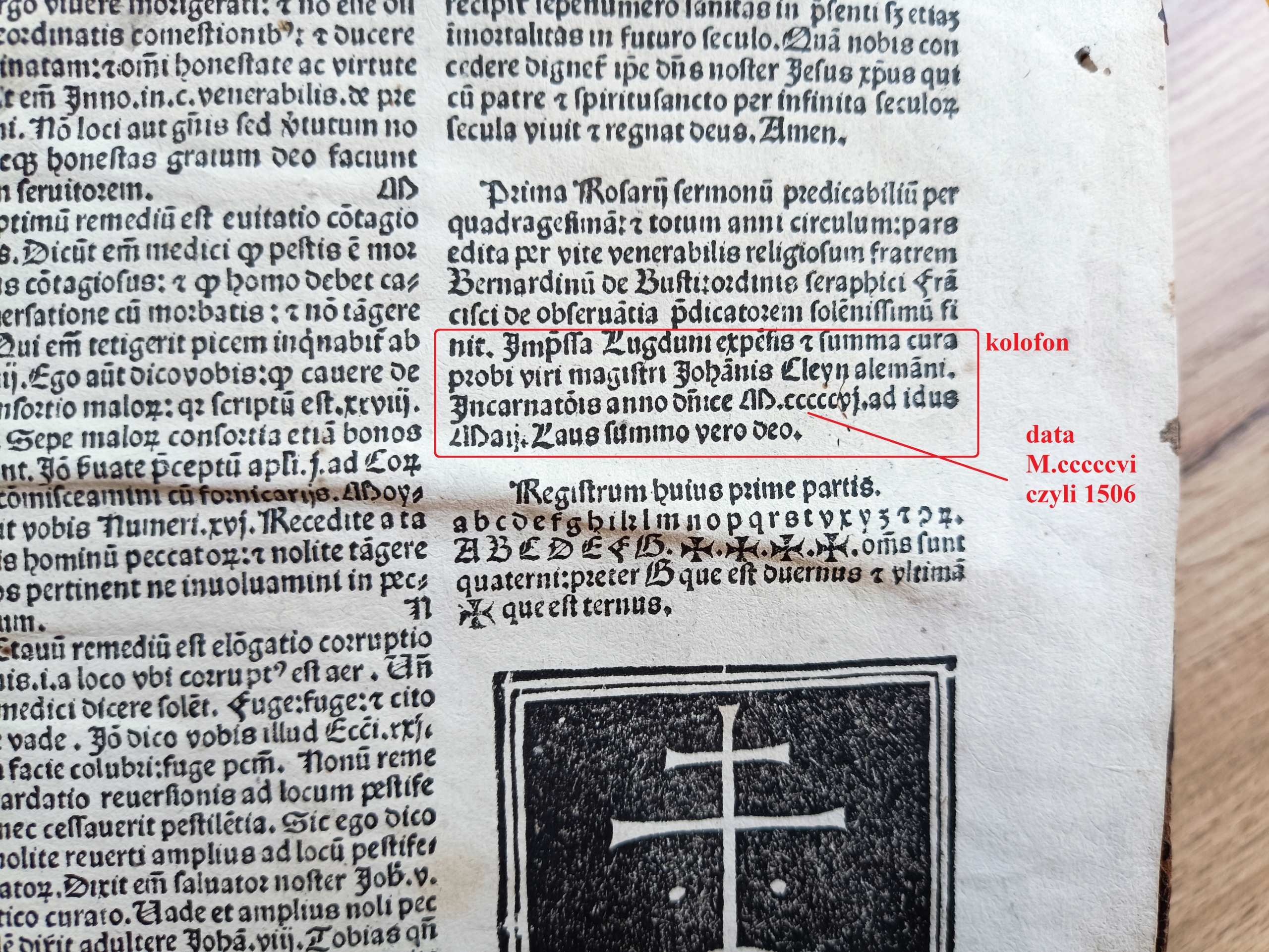 Полная расшифровка: Бернардино Бусти (1506 г.). Rosarium sermonum predicabilium ...ad faciliorem predicantium commoditatem nouiter compilatum. In quo quicquid preclarum & vtile in cunctis sermonariis vsque in hodiernum editis contineur: hic ingeniose enucleatum atque solerti curacollectum inuenies. Парс прима Розария. Impressa Lugduni: expensis et summa cura probi viri magistri Johanis Cleyn alemani… MCCCCCVI ad idus Maij [1506, 15 мая, из колофона - карта CCLX].