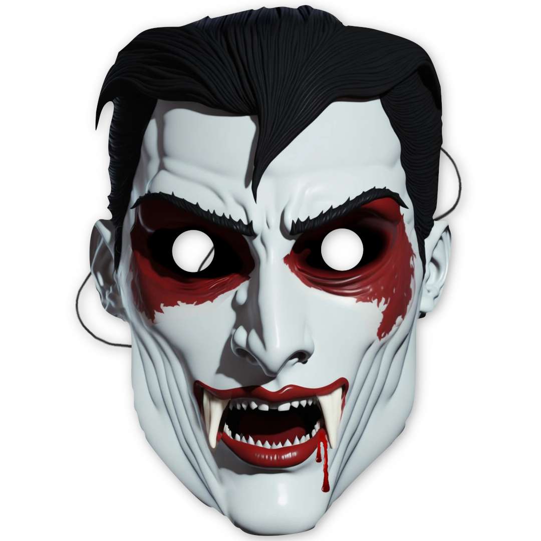 Маска изображает темное и ужасное лицо кровососа. Он был тщательно разработан, чтобы запечатлеть все устрашающие детали — бледную, почти трупную кожу, глубоко посаженные глаза, острые блестящие клыки и зловещую, тревожную улыбку.