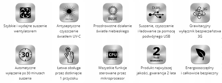 СОДЕРЖИМОЕ УПАКОВКИ: dry-cap uv®, двойной блок питания и USB-кабель, чистящая ткань, руководство пользователя.