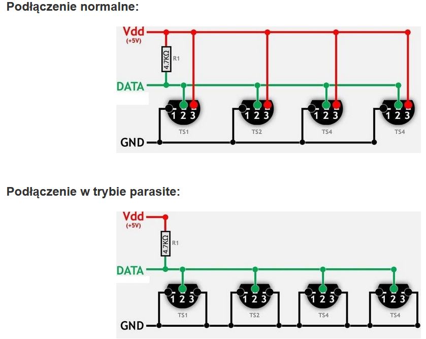 Датчики имеют интерфейс 1 -Wire , обеспечивающий связь, используя только 1 канал данных и комбинацию многих датчиков по одному кабелю, каждый DS18B20 имеет свой собственный уникальный серийный номер, чтобы вы могли различать их друг с другом -спасибо от этого, мы уменьшаем количество кабелей и сохраняете порты микроконтроллера. Метод соединения, показанный в галерее продуктов.