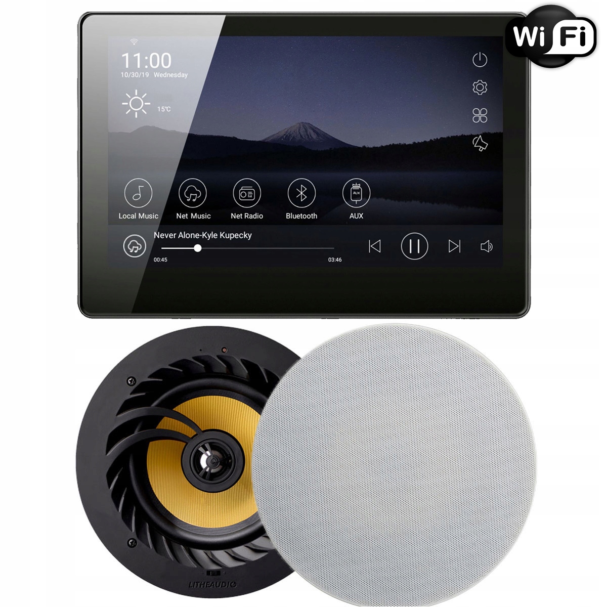 Многофункциональное интернет-радио с Wi-Fi/Bluetooth для скрытого монтажа, модель DM858в черной отделке с цветным 7-дюймовым сенсорным дисплеем IPS и двумя круглыми белыми потолочными динамиками 6,5 дюйма 2x 60 Вт Lithe Aduio - Система ДСППА. Устройство с возможностью независимой регулировки громкости в 2-х зонах.