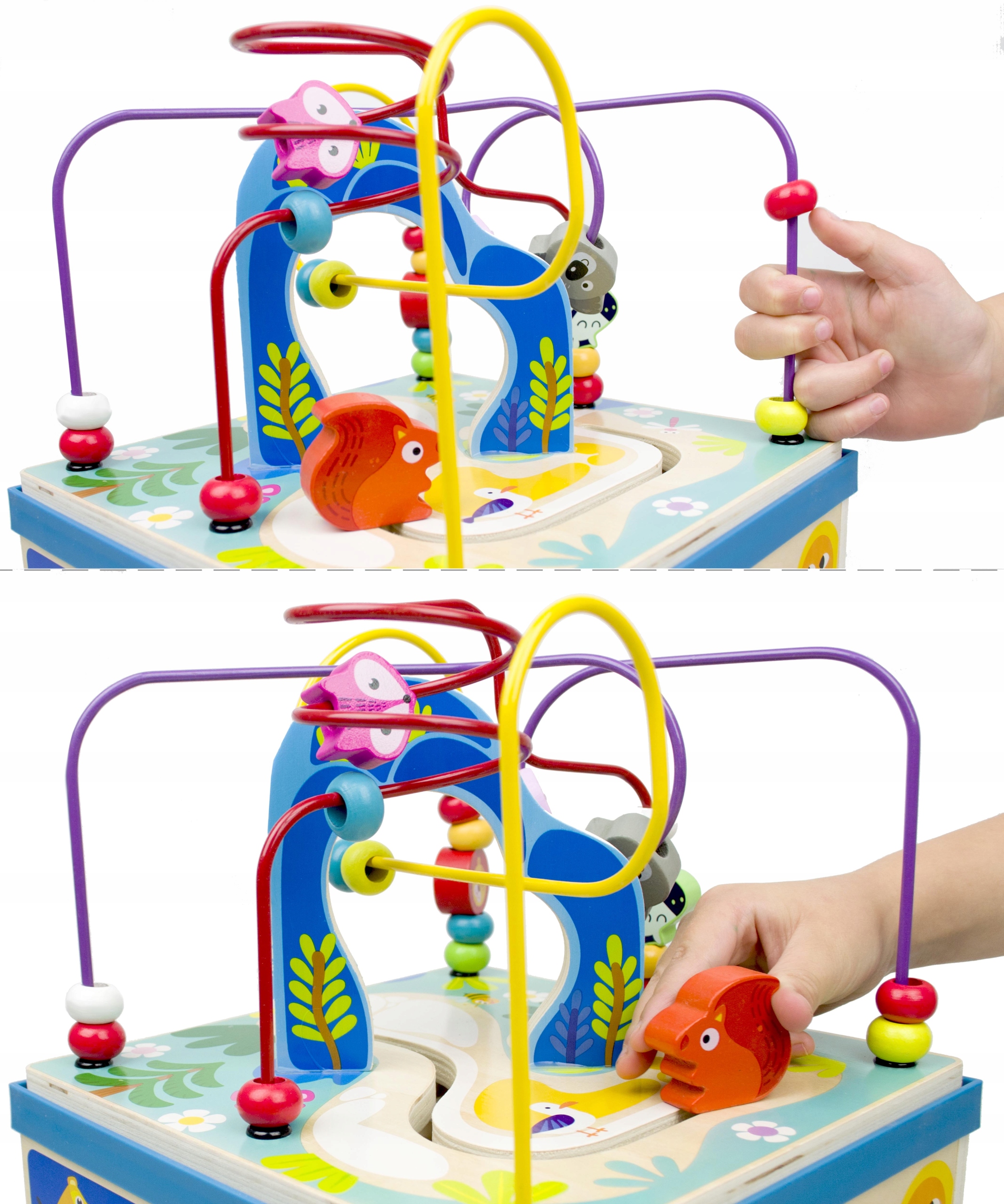 INTERROAD - в верхней части игрушки имеется переплет, на котором размещены бусины различных цветов и форм. Три разноцветных металлических завитка окружают туннель, расположенный в центре. Малыш можетперемещать бусины по извилистому маршруту или перемещать фигурку белки на доске.