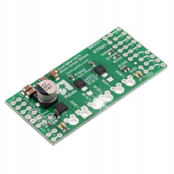 Модуль с двухканальным контроллером двигателя MAX14870, работающим с напряжением от 4,5 В до 36 В и током до 1,7 А на канал (макс. 2,5 А). Систему можно подключить напрямую к разъемам Arduino. Модуль для самостоятельной сборки.
