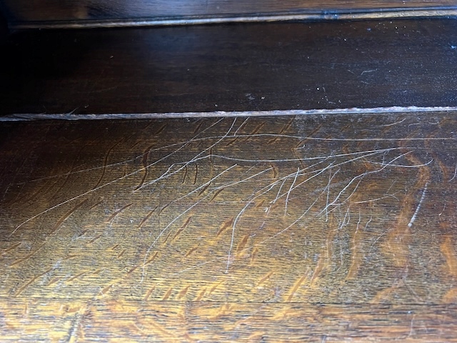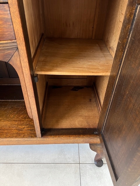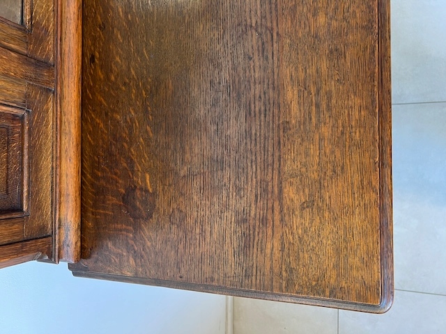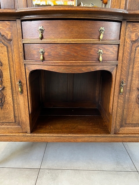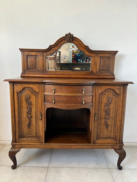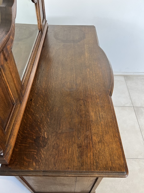 Дубовый комод с зеркалом, сервант. Он был выполнен в стиле Людвика в 1923 году. Очень хорошенькая. Зеркало оригинальное, скошенное, в хорошем состоянии. На столешнице имеются более темные пятна. Замки функциональные, с набором ключей. Полка под ящиками приклеена. На нем есть царапины. Других повреждений и дефектов нет. Имеет типичные следы использования. Он готов к вставке.