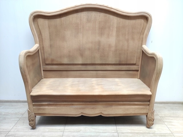 Дубовая скамейка в стиле Людвик. Сделано нами. Скамья очищается от внешних покрытий. Он предназначен для дальнейшей окраски, нанесения воска и т. д. Сиденье можно обить или положить на него подушки. В двух местах естественно высохшая древесина, в двух других — старые следы короеда. Других повреждений и дефектов нет. Готов к дальнейшей работе.
