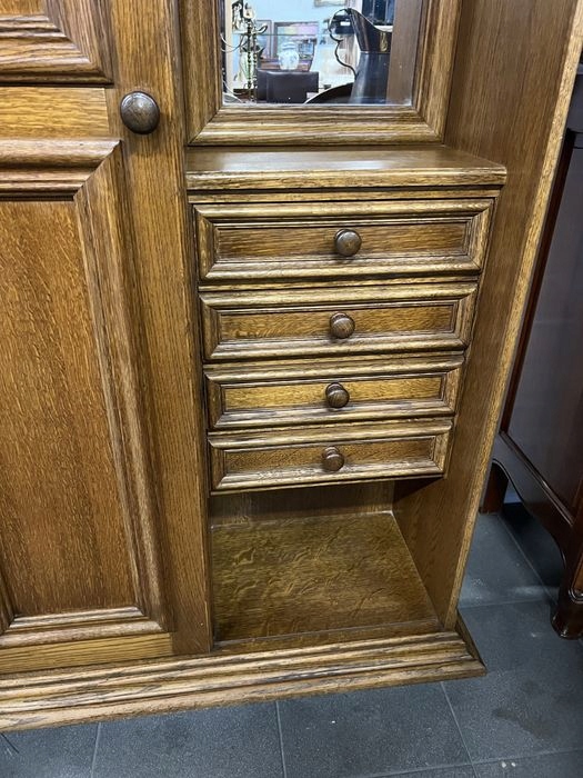 Внизу имеется дверца с зеркалом, выдвижными ящиками и полкой.