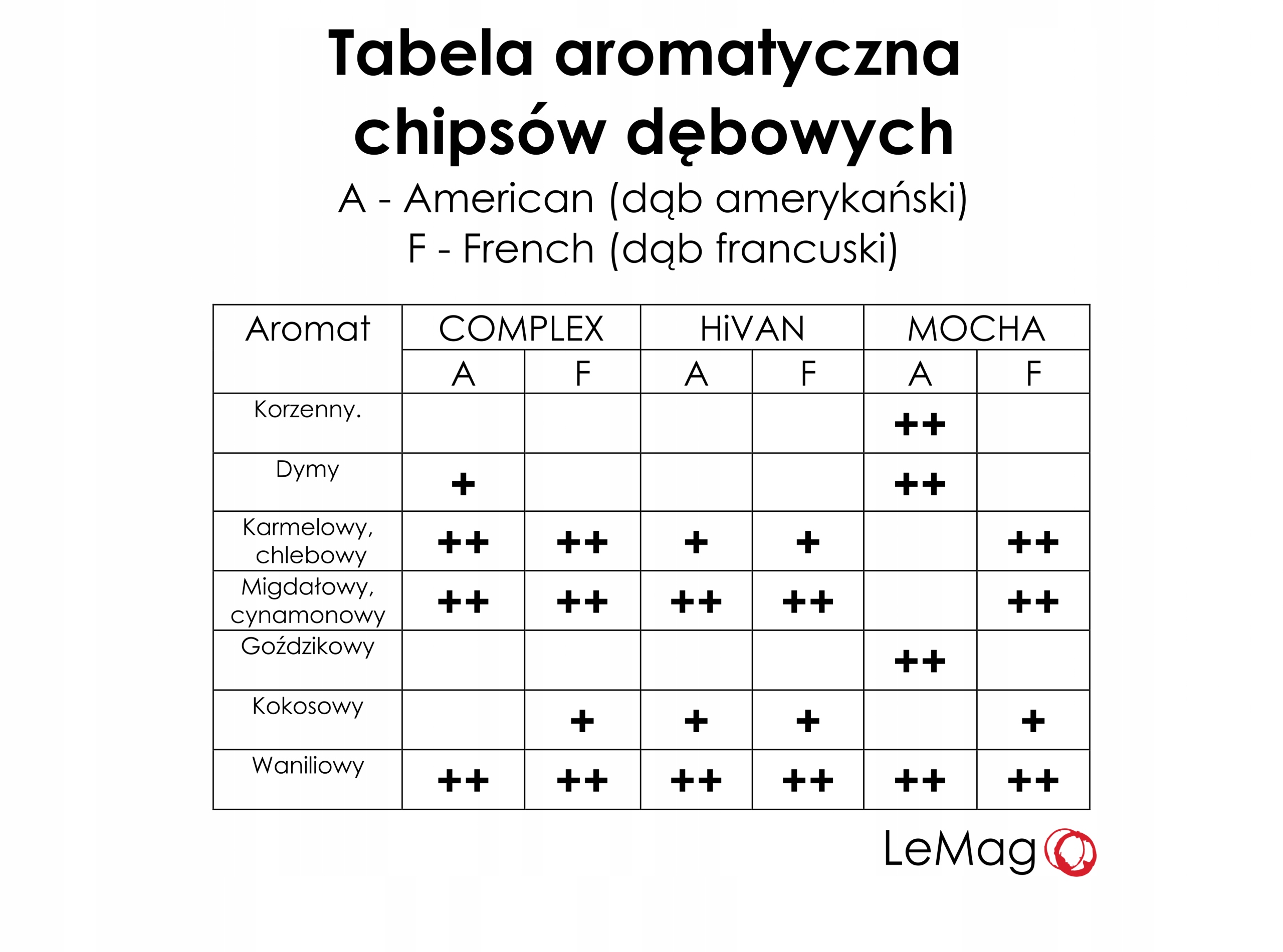 Американский дубовый чипс Американский мокко - самая высокая степень инструментов. Ароматы и ароматы являются наиболее выраженными и наиболее интенсивными здесь. Какао и темный шоколад - это ароматы, которые соответствуют весу, более четкие красные вина и дистилляты.