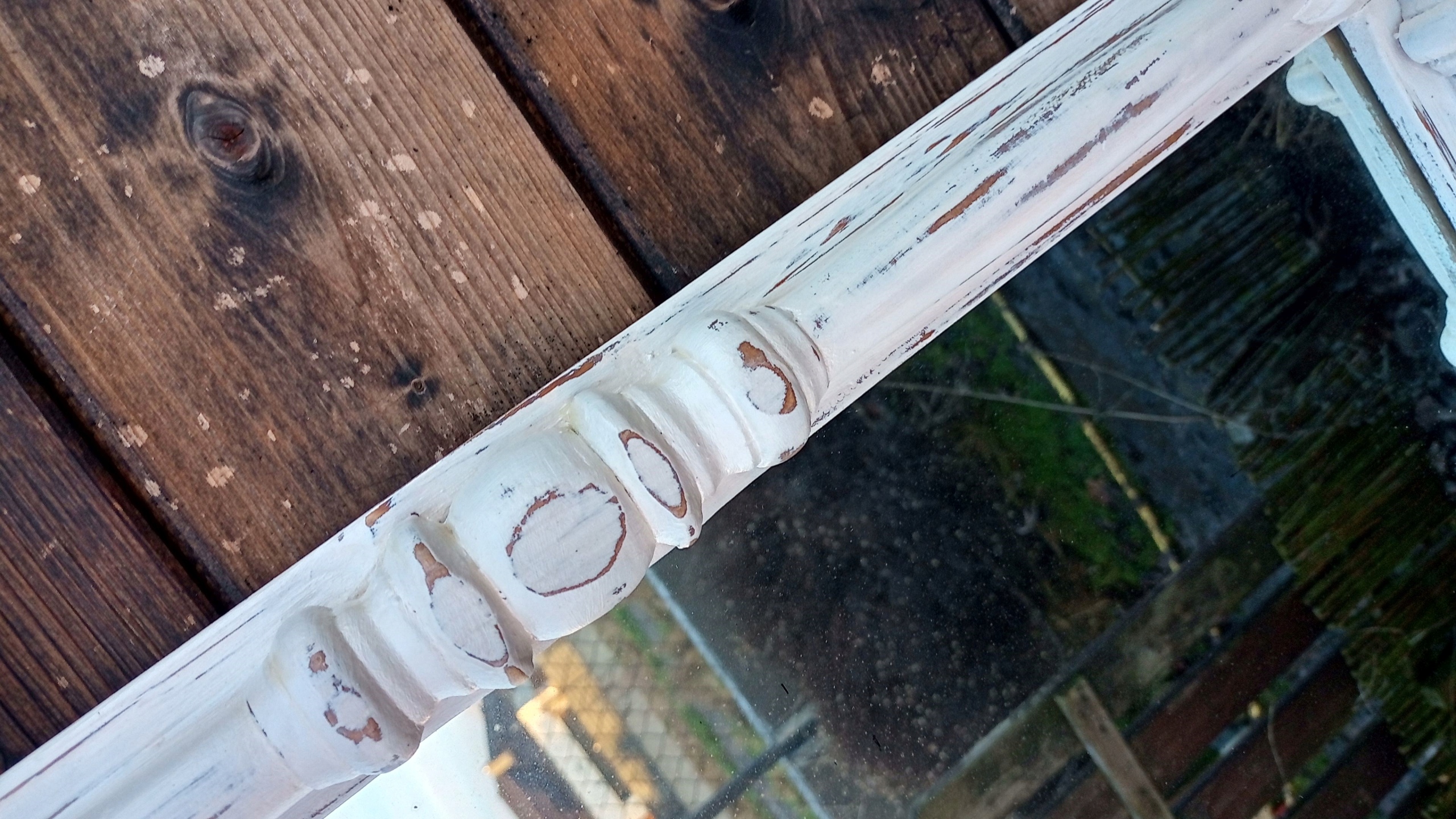 Деревянная рама, окрашенная в цвет экрю, потертая, намеренно состаренная.