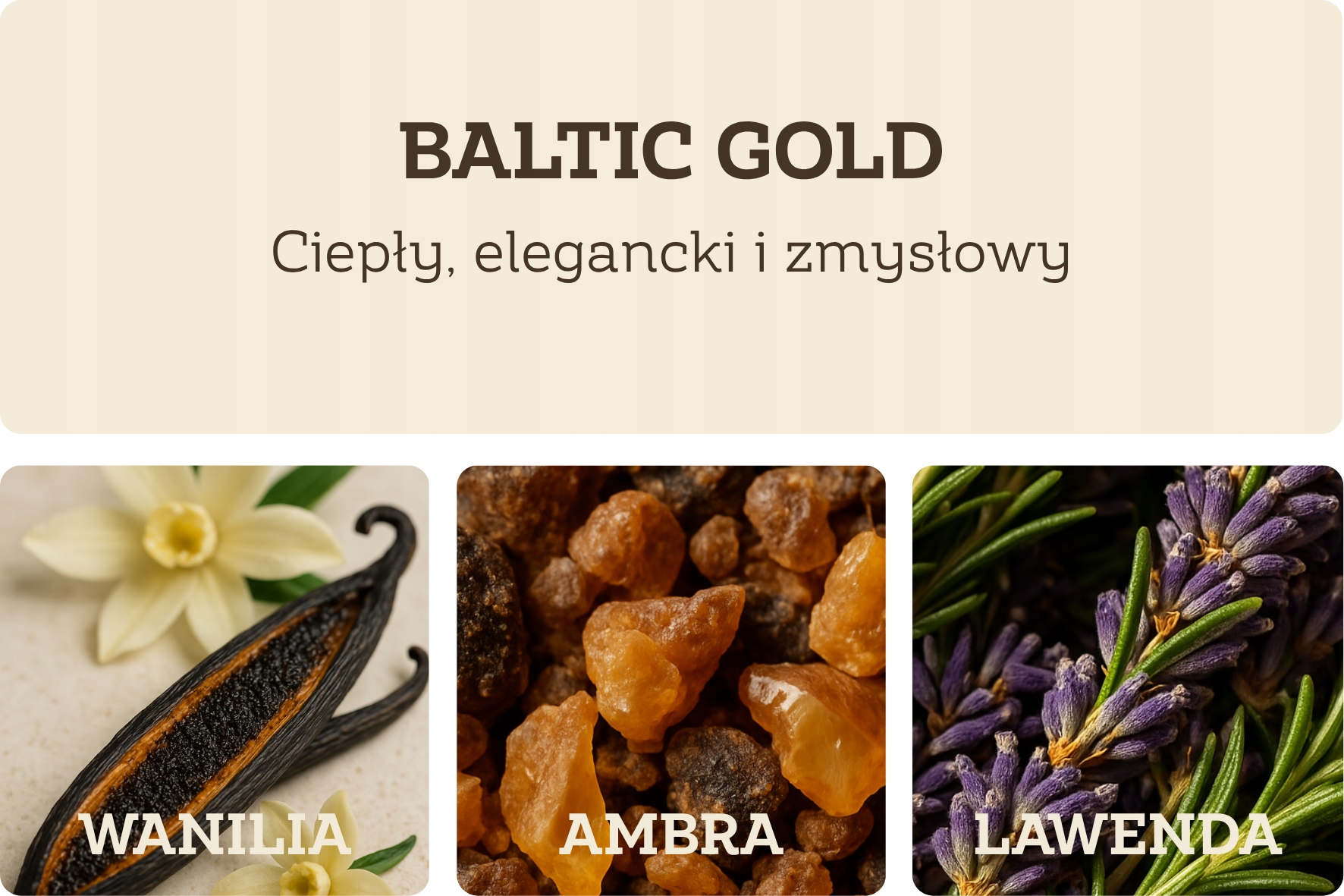 - Две ароматические вставки Baltic Gold - теплый, чувственный и элегантный ароматванили, лаванды и амбры. Классическая композиция с характером и глубиной.