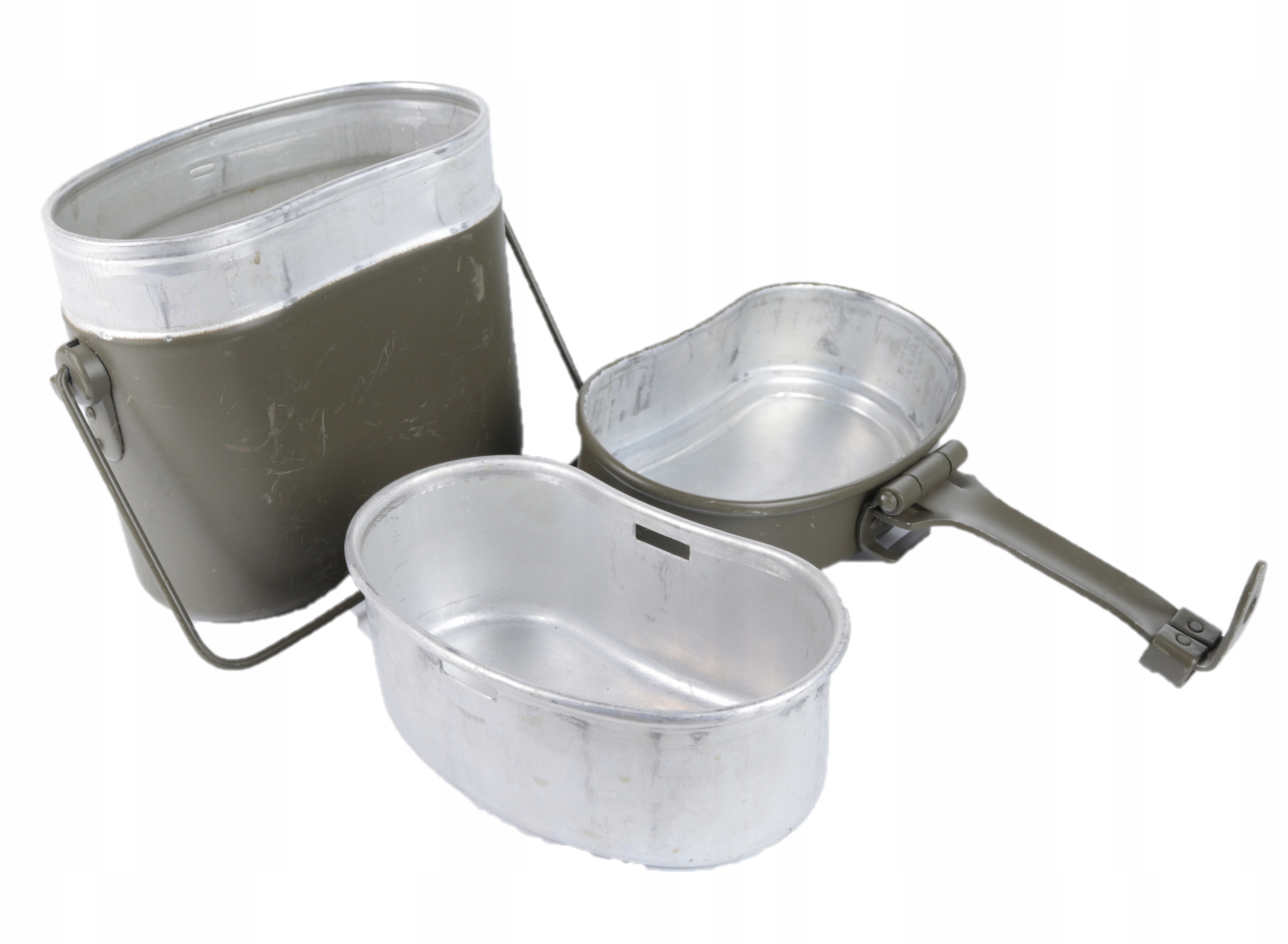 В комплект входит венгерская армейская фляга (очень похожая на польскую), которую можно использовать на плите. Столовые имеют следы хранения - ручки часто погнуты, что является следом времени, но на функциональность столовой это не влияет.