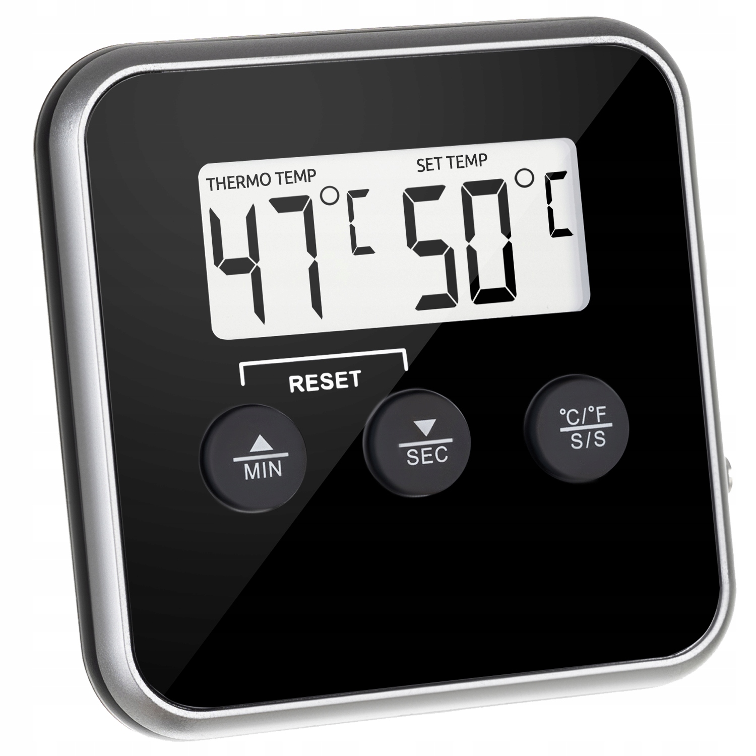 Термометр имеет зонд, изготовленный из нержавеющей стали высочайшего качества, устойчивый к царапинам, вмятинам и другим механическим повреждениям, а также к высоким температурам. Корпус термометра имеет интуитивно понятную панель управления. Устройство имеет функцию блокировки времени – предназначенную для непрерывного контроля температуры и таймер со звуковым сигналом. Он работает в диапазоне от 0 до 300 градусов Цельсия с одним шагом. Зонд из термостойкой нержавеющей стали расположен на конце длинного и удобного кабеля.