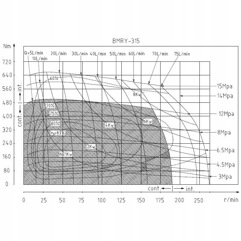 Усиленный гидравлический двигатель Bmry 315, разработанный для тяжелой работы на сельскохозяйственных и промышленных устройствах. Максимальные параметры в непрерывной работе: поток 60 л/мин, оборот 195 об/мин, давление 120 бар, мощность 9,6 кВт, крутящий момент 470 Нм.