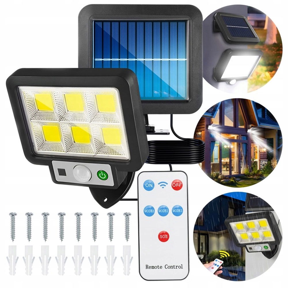 Солнечный уличный светильник, фонарь BK-128-6COB с дистанционным управлением, датчиком движения и сумерек. Это круглогодичный солнечный светильник со 120 светодиодами в 6 модулях COB, предназначенный для настенного монтажа.