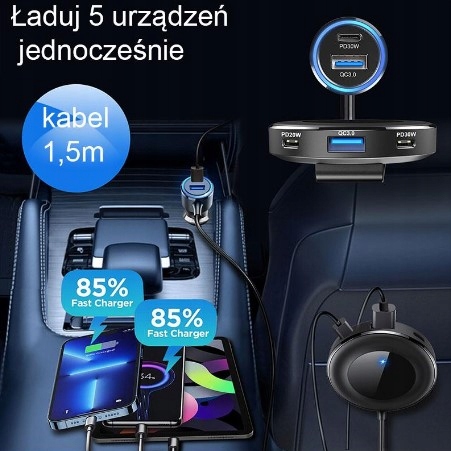 Очень мощное автомобильное зарядное устройство 5 в 1 мощностью 98 Вт с 3 USB-C + 2 USB-кабелями