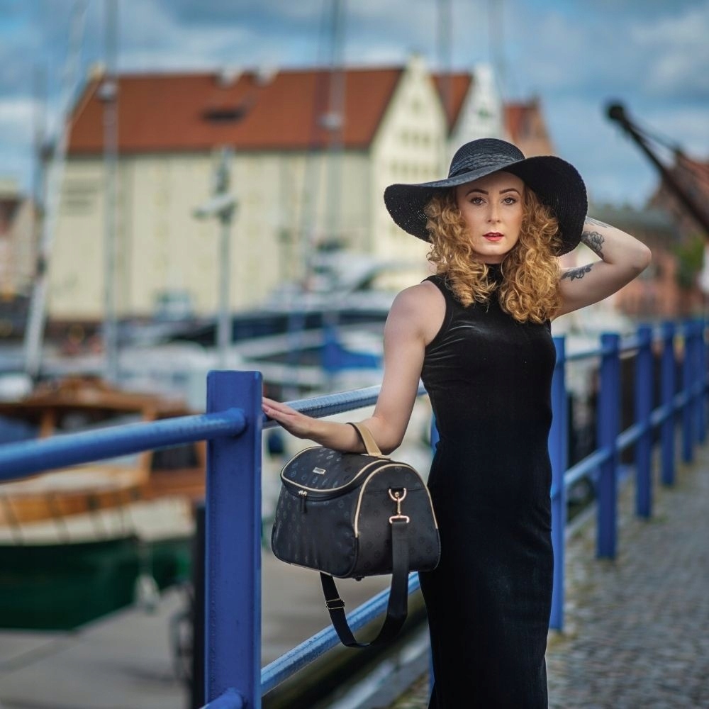 При разработке этой модели была учтена каждая мелочь - две молнии, усиленная ручка, плечевой ремень, металлические ручки для золотых пряжек ремня. Золотая отделка прекрасно гармонирует с темно-черным материалом, из которого изготовлена косметичка.