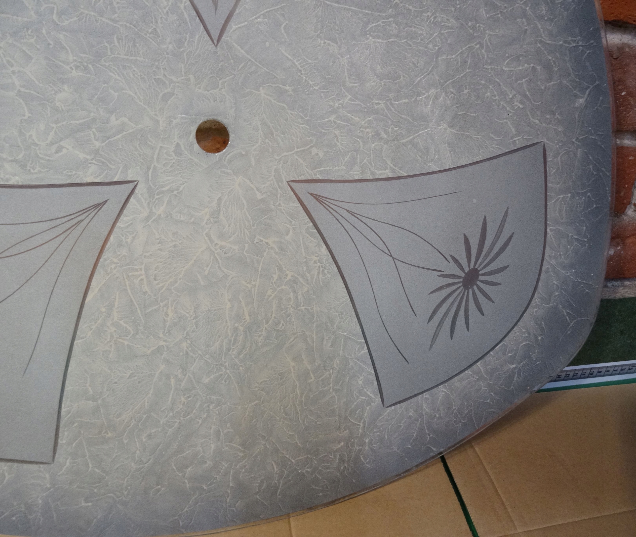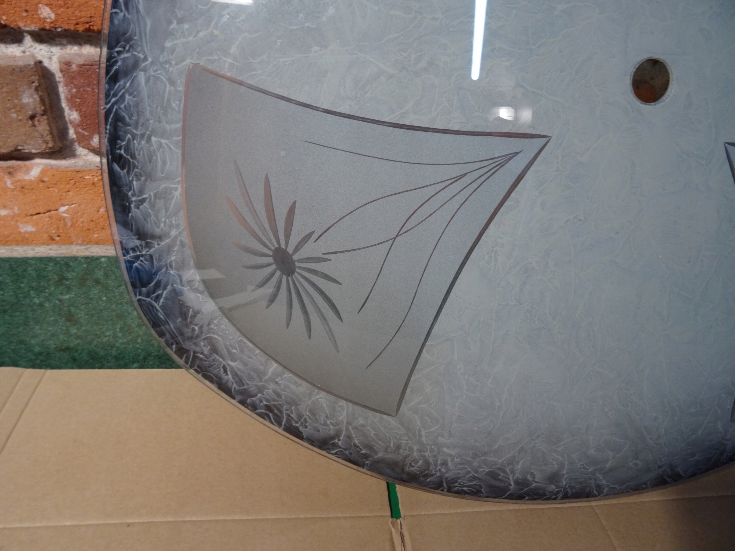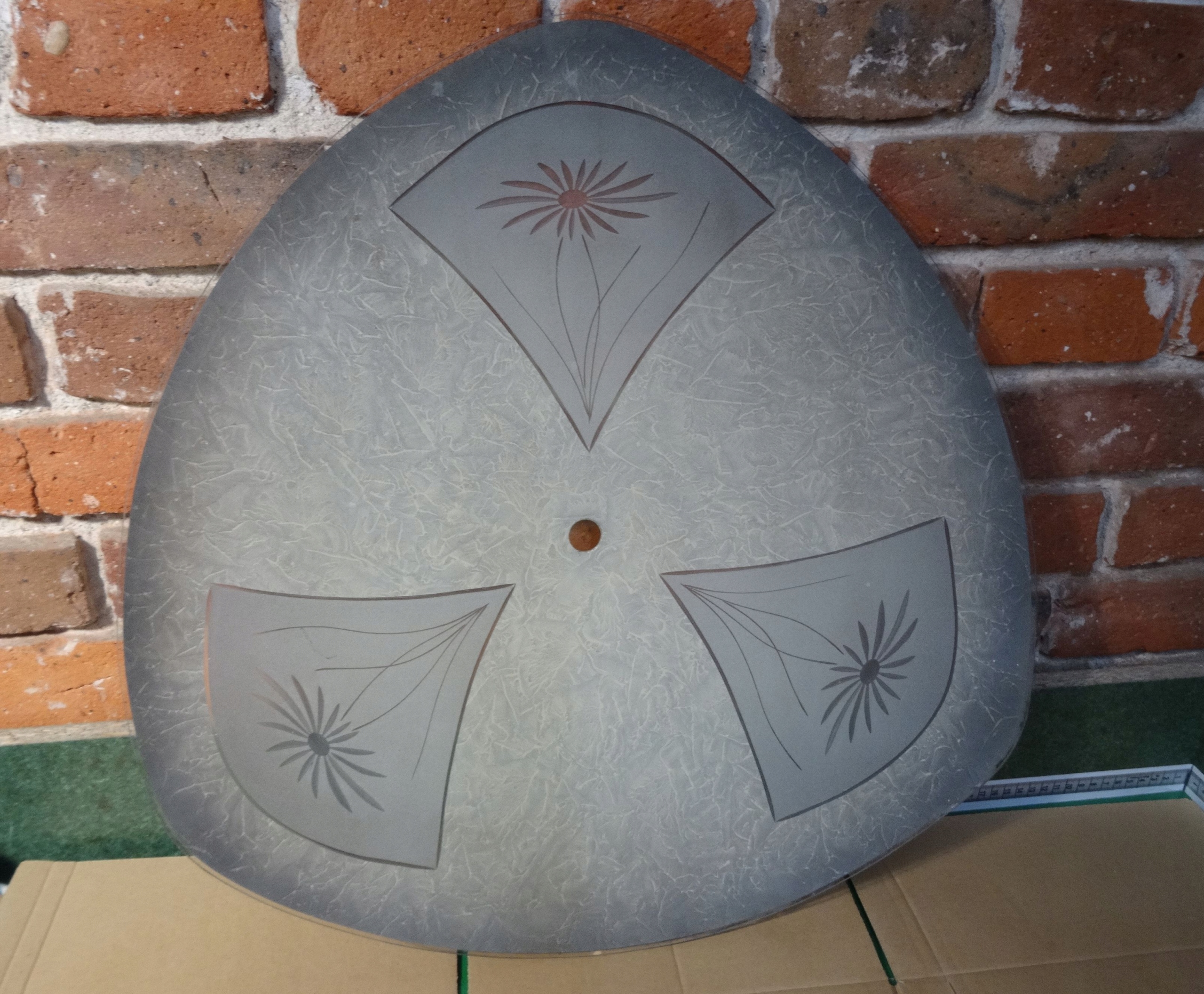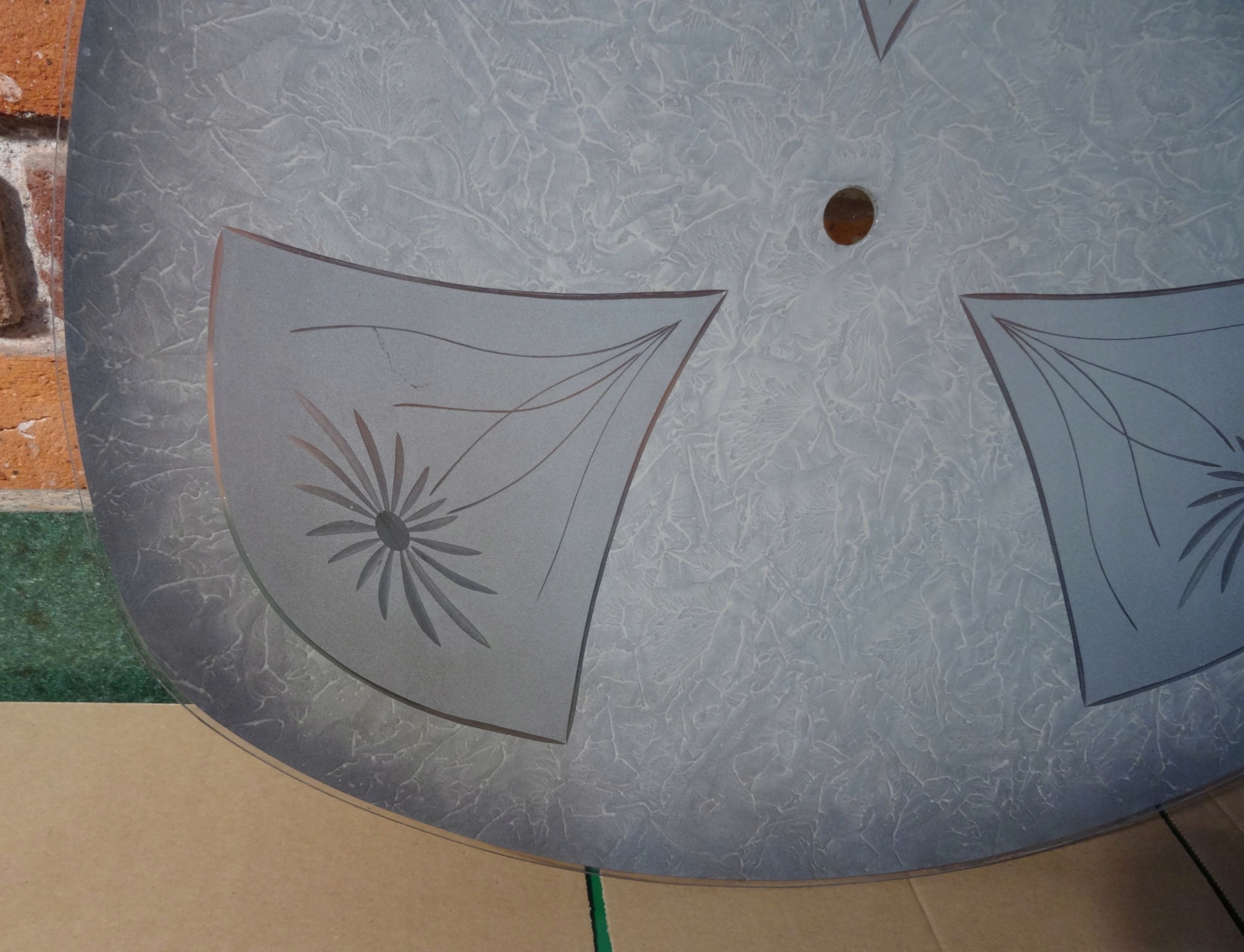 Очень большой абажур для подвесного светильника. Внутренняя часть чаши расписана майо, в стекле между ними вырезаны цветы. Оригинальный абажур, старый, очень красивый.