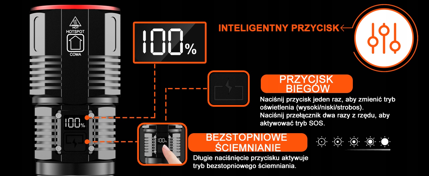 - ✔ -акумулятор светодиодный фонарик имеет революционную функцию - Бесплатное затемнение ! Длинное нажатие переключателя активирует режим потемнения без этапа. Вы можете точно адаптировать яркость фонарика к различным потребностям, переключаясь между люменом 50000-500 в зависимости от ваших потребностей. Например, вам может понадобиться более тонкий свет в палатке для чтения или более легкий луч света во время ночной поездки в трудную местность. Точный контроль светового потока, фонарик с бесшумным затемнением уменьшает стимуляцию человеческого глаза из -за прыжков яркости источника света и улучшает комфорт освещения.