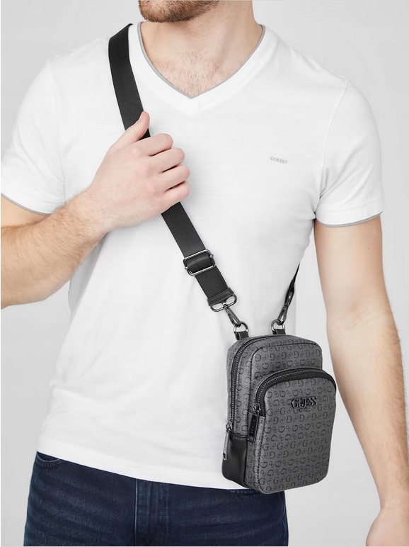Эта мини -сумочка поперечного тела для небольших вещей имеет крепеж на верхней молнии, передний карман для молнии и логотипа спереди. задние D-кольца, чтобы прикрепить ремень.