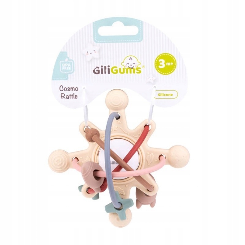 Игрушка сочетает в себе преимущества погремушки и прорезывателя! В центральной точке находится гремящий шар, а вокруг него мягкие гибкие веревки, по которым мы можем перемещать движущиеся элементы. Форма игрушки и ее размеры идеально адаптированы для маленьких ручек. Погремушка украшена выступами различной формы, которые принесут облегчение малышу, у которого режутся зубки.