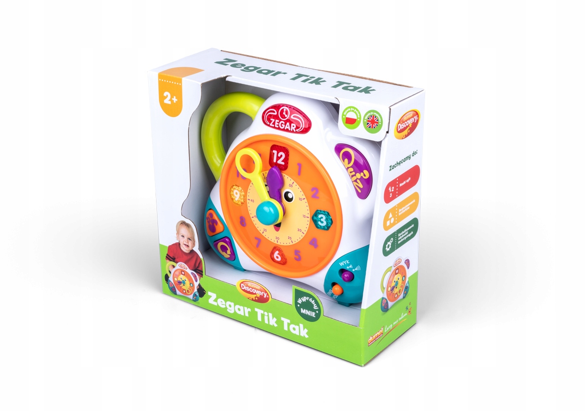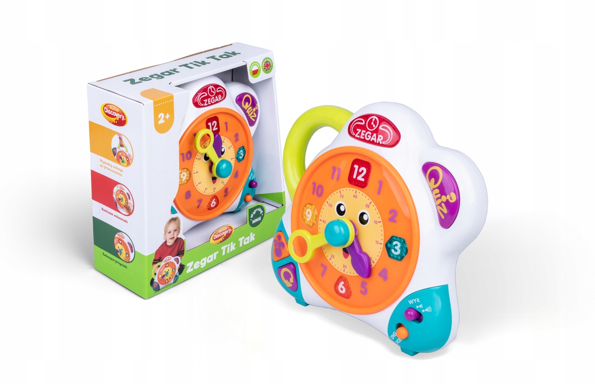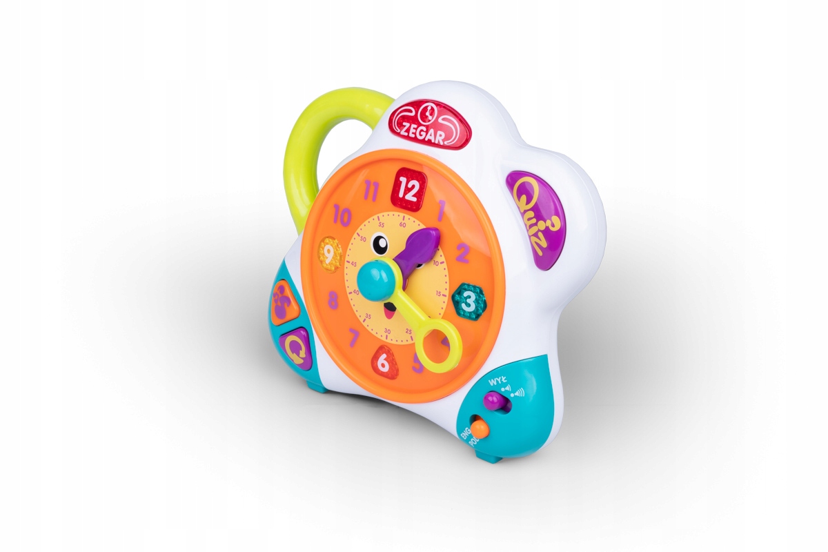 Веселые, двуязычные (английские/польские) часы, которые посредством игры помогут ребенку в учебных номерах, часах и распознавании форм. Часы также оснащены веселыми мелодиями и светящимися пуговицами , которые побуждают ребенка играть. Удобная ручка позволит вам взять с собой часы в любое место