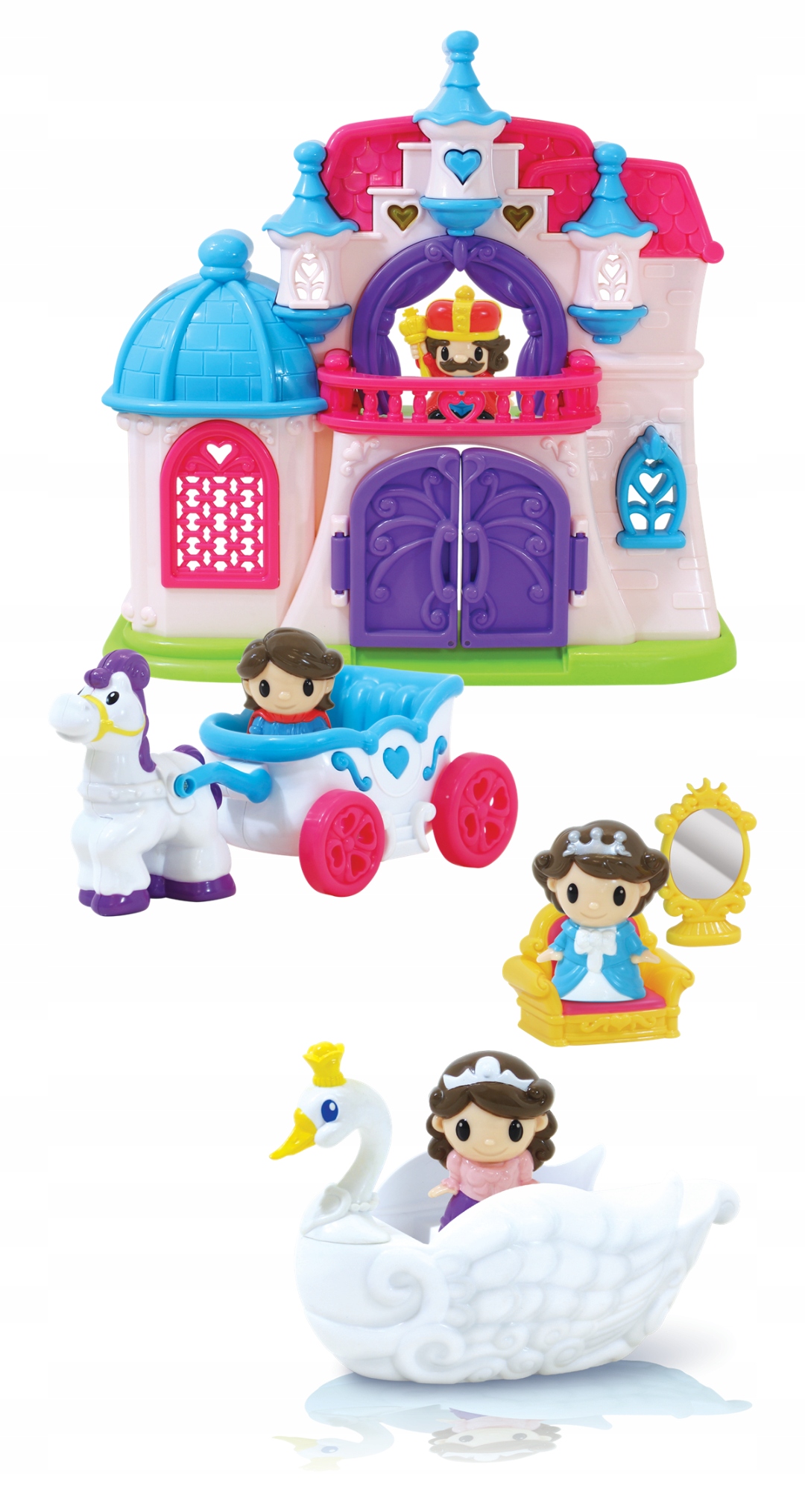 Погрузитесь в сказочное королевство, полное волшебных элементов! Играйте с этим набором фигурок в ролевые игры и развивайте свое воображение и творческие способности. Помимо впечатляющего дворца, вы также найдете его обитателей (короля, королеву, принцессу и принца), карету, лебедя, на крыльях которого можно перевозить фигурки, и аксессуары, полезные во время игры: трон и зеркало. На вершине дворца находится кнопка в форме сердца, которая включает свет и чарующую мелодию.