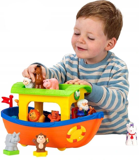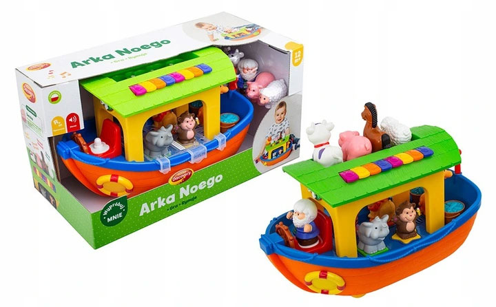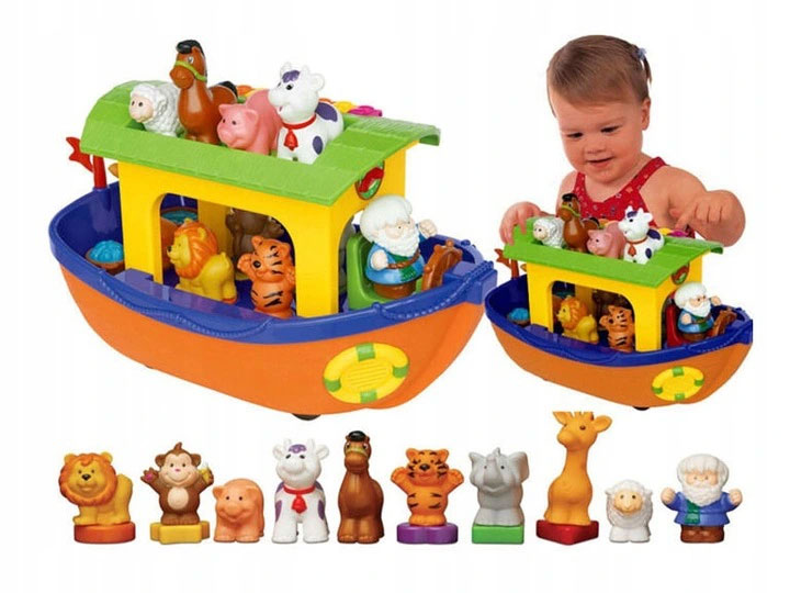 Ноев ковчег содержит 9 животных, которые будут вознаграждать детей реалистичными звуками или забавными стишками каждый раз, когда они угадают правильную форму и поместят ее в нужное место. Руль ковчега при повороте издает реалистичные звуки. В игрушке есть красочное мини-пианино, на котором можно сыграть собственную композицию. К ковчегу можно прикрепить веревку, с помощью которой малыш сможет его носить. Во время движения Ковчег имитирует движения «лодки, плывущей по волнам».