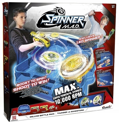 Соревнуйтесь в дуэли спиннеров! Делюкс-набор позволит вам вместе с другом устроить настоящую светодиодную битву. В комплект входят 2 одиночные пусковые установки, арена и 2 светодиодных волчка. Чтобы начать играть, поместите волчок в пусковую установку, затем используйте усилитель мощности, расположенный в пусковой установке, чтобы увеличить мощность волчка, и выстрелите в него из пусковой установки. Побеждает тот волчок, который продержится дольше всех!