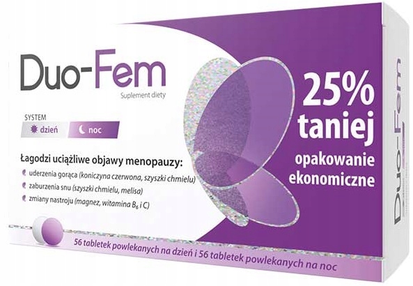 ДУО-ФЕМ – это биологически активная добавка, содержащая 56 таблеток, покрытых оболочкой, для дневного применения и 56 таблеток, покрытых оболочкой, для ночного применения в одной упаковке. Ежедневная формула сочетает в себе экстракт красного клевера с высоким содержанием витаминов B6, C и D с добавлением цинка и магния. Ночные таблетки представляют собой комбинацию экстракта красного клевера с экстрактом мелиссы, порошкообразных шишек хмеля и витаминов C, D, E и цинка.