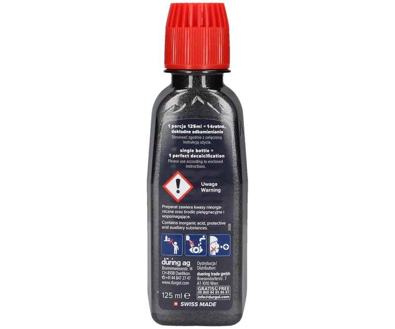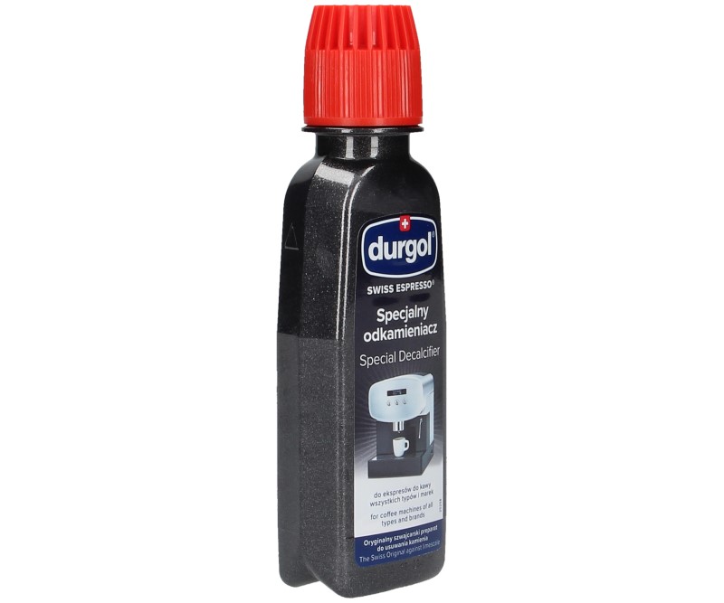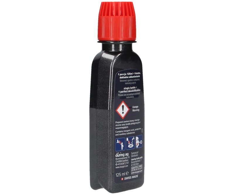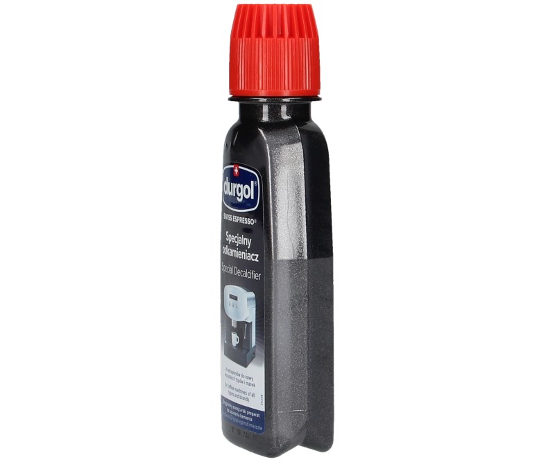 Упаковка Durgol® Swiss Espresso® состоит из 2 бутылочек по 125 мл каждая, одной бутылочки достаточно для одной очистки прибора от накипи. Если емкость резервуара кофемашины превышает 1,5 литра, рекомендуется использовать 2 упаковки по 125 мл.