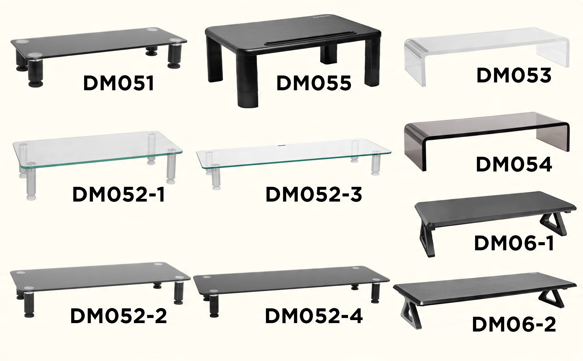 DM052-1: (цвет: прозрачный), размеры 56 х 24 см; регулировка высоты: 9-10,5 см; макс. нагрузка: 20 кг