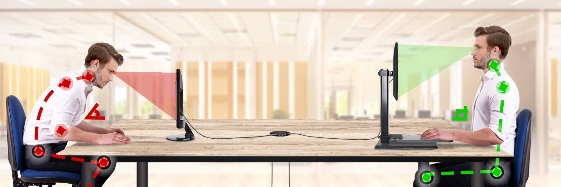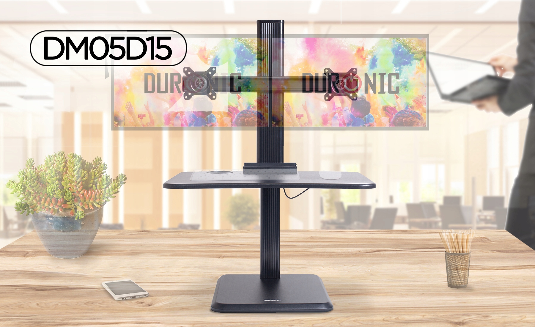 - Duronic DM05D15 — очень эргономичная подставка для двух мониторов, позволяющая работать стоя или сидя. Вы можете разместить подставку на своем столе. Подставка позволяет установить два монитора диагональю 13-24 дюйма в стандарте VESA 75 или VESA 100.
