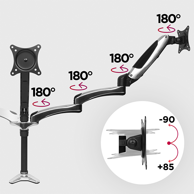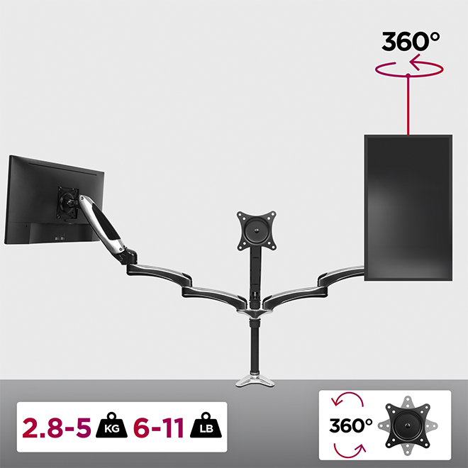 - Держатель оптимален для мониторов размером 15–27 дюймов по стандарту VESA 75 или 100 (расстояние по горизонтали и вертикали должно составлять 75 или 100 мм). Каждый кронштейн позволяет установить монитор весом до 5 кг каждый и обеспечивает превосходную устойчивость. Рукоятка оснащена газовой пружиной, которая обеспечивает еще более свободное движение руки и легкую регулировку высоты. Если ваше оборудование имеет другие размеры, посетите другие наши аукционы, чтобы выбрать лучшее решение.