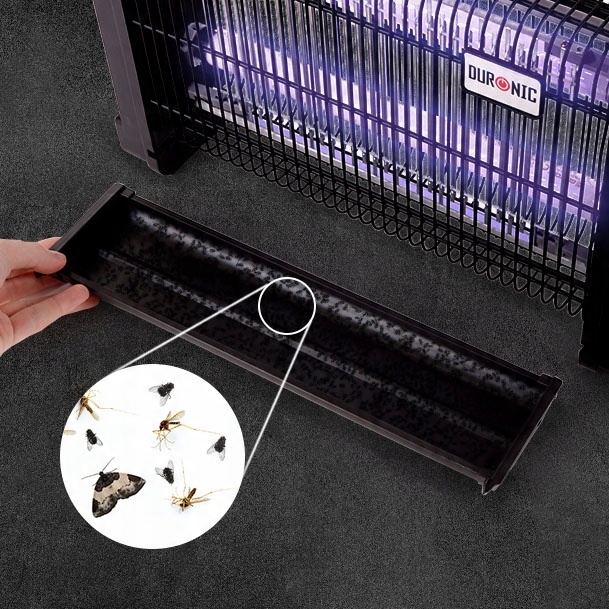 Мухи, мошки, комары и мотыльки, привлеченные светом, поражаются лучом электричества. Мертвые насекомые падают на лоток для сбора. Контейнер легко вставлять и чистить.