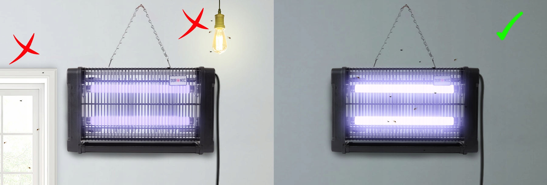 Две ручки на корпусе устройства позволяют закрепить отпугиватель на стене или потолке. Подвешивание светильника вертикально требует соответствующих размеров крючков и цепи. Однако наилучшей производительности устройства можно добиться, поместив его на ровную, отдельно стоящую поверхность.