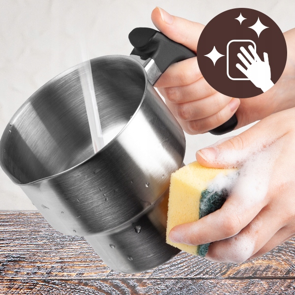 Кувшин из нержавеющей стали вмещает до 500 мл кипящего молока или 260 мл для вспенивания. Благодаря корпусу из чистой нержавеющей стали кувшин легко чистится; он не оставляет пятен и не пористый, поэтому после стирки не сохраняет запахи и бактерии. Чтобы очистить кувшин, просто вымойте его вручную теплой мыльной водой. Эргономичная ручка облегчает наливание и дает вам полный контроль, так что вы сможете открыть в себе своего внутреннего художника по декорированию кофе.