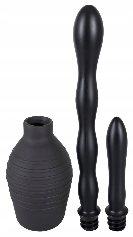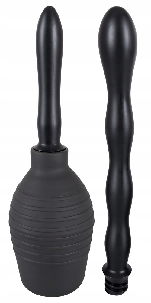 Интимный анальный душ с резервуаром для воды объемом 300 мл и высотой 13 см с двумя черными ввинчивающимися душевыми насадками для распыления мелкой струи.
