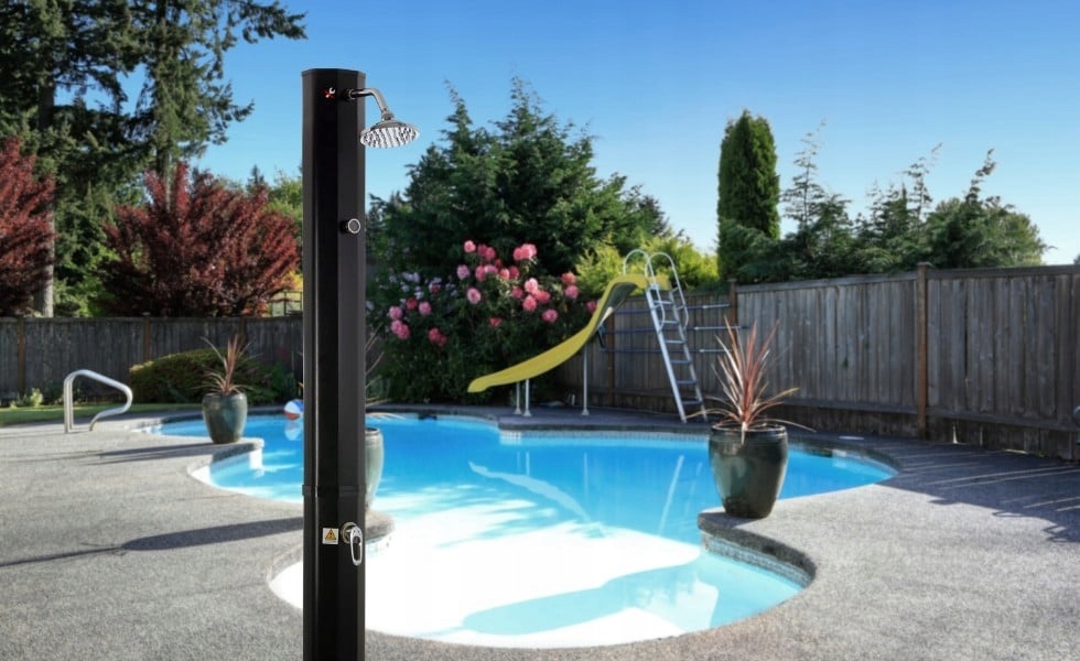 Температура воды регулируется с помощью рычага смесителя, расположенного в центре солнечного душа.