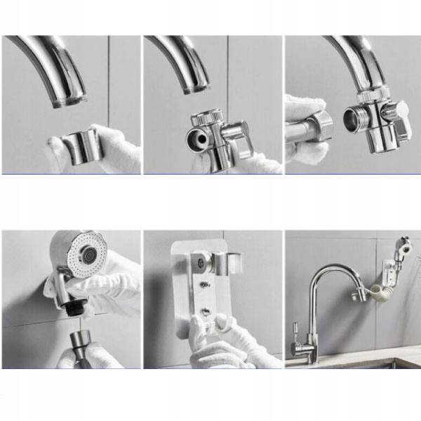Внешний удлинитель смесителя для универсального использования на кухне и в ванной комнате. . Простая установка со всеми аксессуарами в комплекте (душевая насадка, шланг, держатель, клапан, крепление)