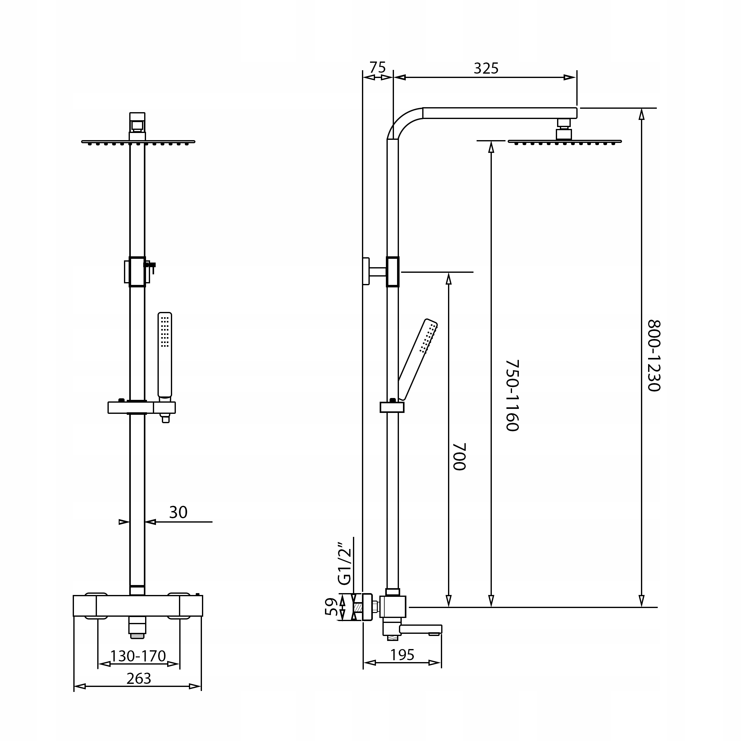 В комплект входят: смеситель с термостатом, складной излив для ванны, душевая штанга с тропическим душем, душевая трубка, шланг длиной 150 см и кулачки для установки смесителя. с расстоянием между соединениями от 13 см до 17 см.