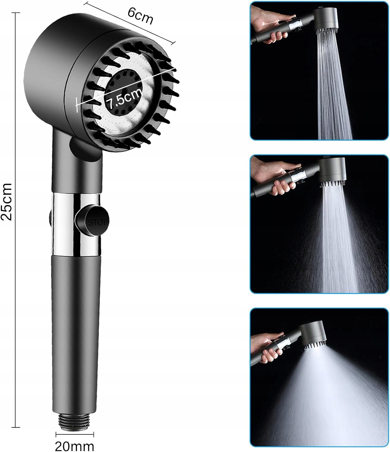 -Этот ручной душ предлагает режим струи (успокаивающий и мягкий), режим тропического душа (мягкая вода), режим смешивания (сильный импульс)и режим ополаскивания (снимите насадку).