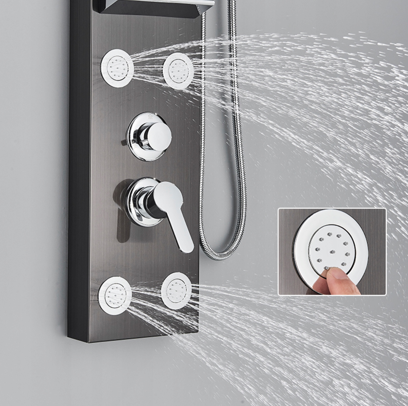 Это эксклюзивная, стильная, современная душевая панель с гидромассажем, душевой лейкой и тропическим душем, а также полочкой для косметики. Изделие изготовлено из высококачественной нержавеющей стали, латуни и АБС-пластика высочайшего качества. Панель с тропическим душем и гидромассажем содержит все необходимые элементы для установки в вашей ванной комнате, ванной комнате или частном СПА. Он прекрасно вписывается в обстановку и влияет на внешний вид всей ванной комнаты.