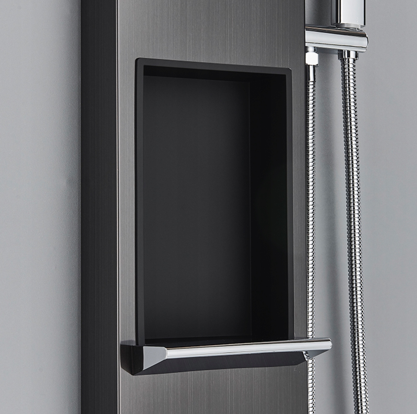 Это эксклюзивная, стильная, современная душевая панель с гидромассажем, душевой трубкой и дождевым душем. душ и полка для косметики. Изделие изготовлено из высококачественной нержавеющей стали, латуни и АБС-пластика высочайшего качества. Панель с тропическим душем и гидромассажем содержит все необходимые элементы для установки в вашей ванной комнате, ванной комнате или частном СПА. Он идеально вписывается в обстановку и влияет на внешний вид всей ванной комнаты.