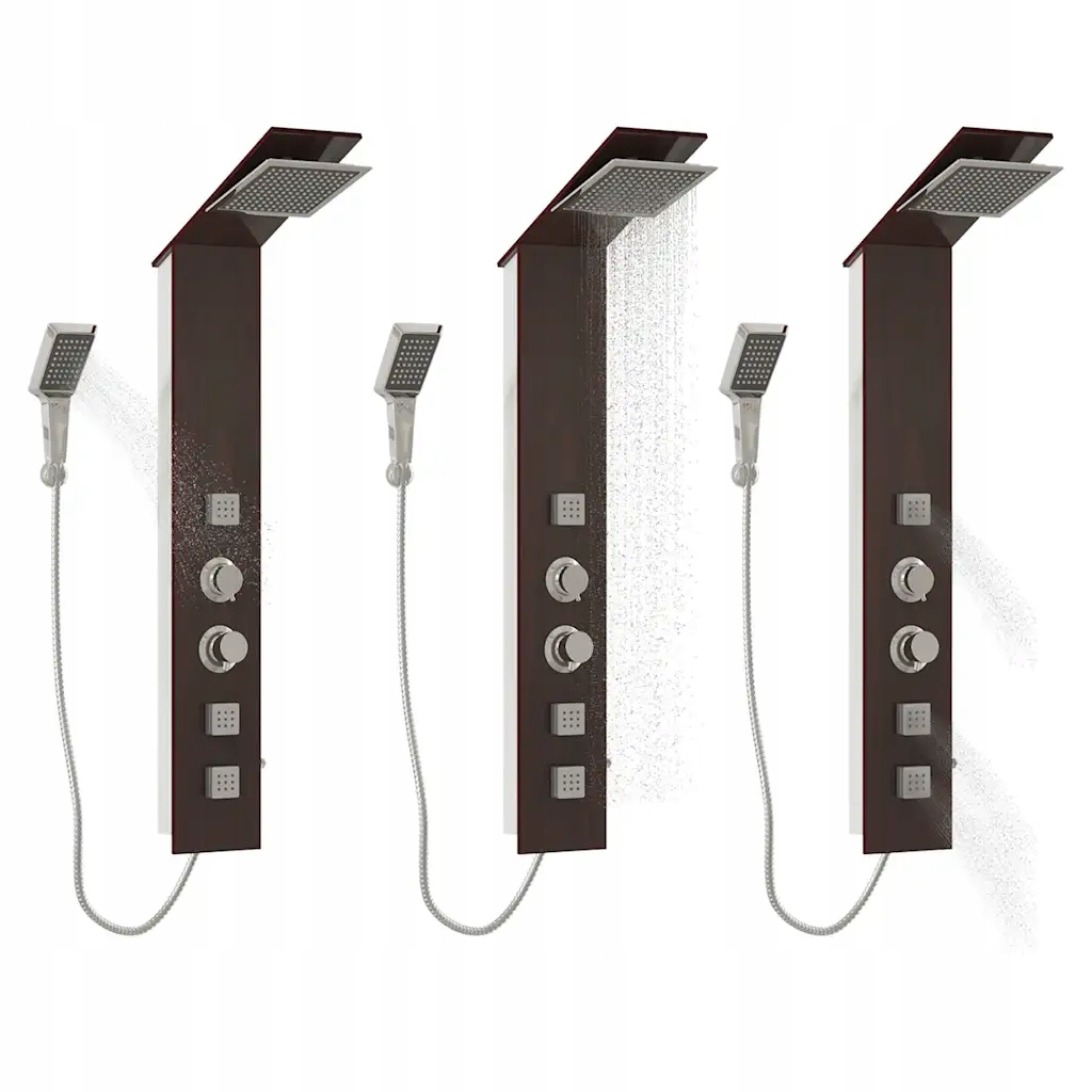 Выполненная из высококачественного стекла с древесным узором, душевая панель предлагает три функции: тропический душ, массажные форсунки и ручную душевую лейку. Вы можете легко выбирать между ними с помощью ручки.