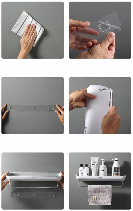 Просто очистите стену, на которой будет установлена полка, а затем приклейте прилагаемую самоклеящуюся заплатку ручки и наденьте на него полку сверху, вот и все! :)