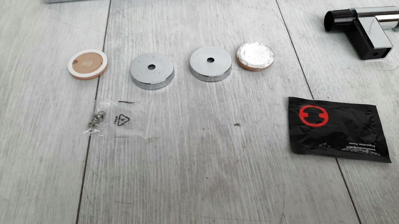 СОСТОЯНИЕ: Штанга немного согнута посередине, видно на фото, один настенный держатель приклеен - Б/у.