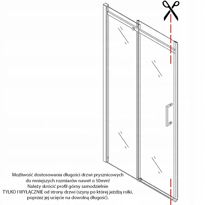 ☑️ Возможность регулировки длины душевой двери на меньшую сторону размер до 50мм! Укорачивать верхний профиль следует самостоятельно ТОЛЬКО И ТОЛЬКО со стороны двери (рейку, по которой бегут ролики, подрезая ее на любую длину).< /п>