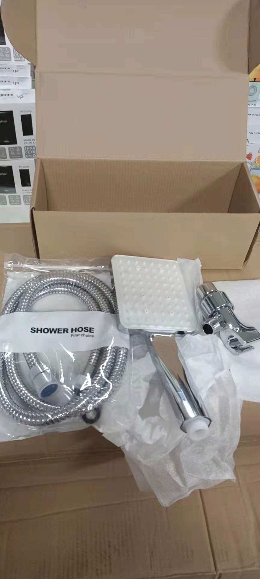 Содержимое упаковки: 1 насадка для душа; 1 шланг из нержавеющей стали (1,5 м); 1 пряжка; 4 резиновых подушечки